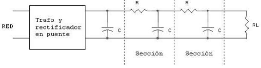 Cuando la corriente por la carga es grande, los filtros LC de la figura presentan una mejora con respecto a los filtros RC. De nuevo, la idea es hacer que el rizado aparezca en los componentes en serie, las bobinas en este caso. Además, la caída de tensión 15 continua en las bobinas es es mucho menos porque solo intervienen la resistencia de los arrollamientos. Los condensadores pueden ser de 1000 µF y las bobinas cuanto mas grandes mejor. Normalmente estas últimas suelen ocupar casi tanto como el transformador y, de hecho, parecen transformadores, menos mal que con una sola sección ya podemos reducir el rizado hasta niveles bajísimos.